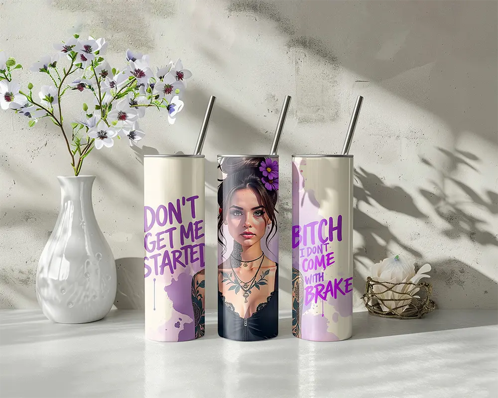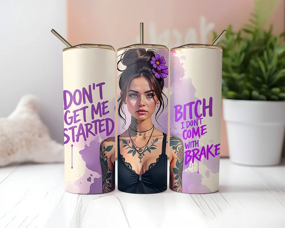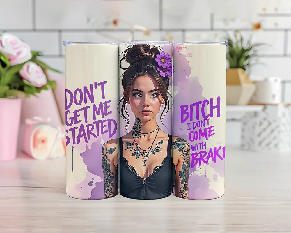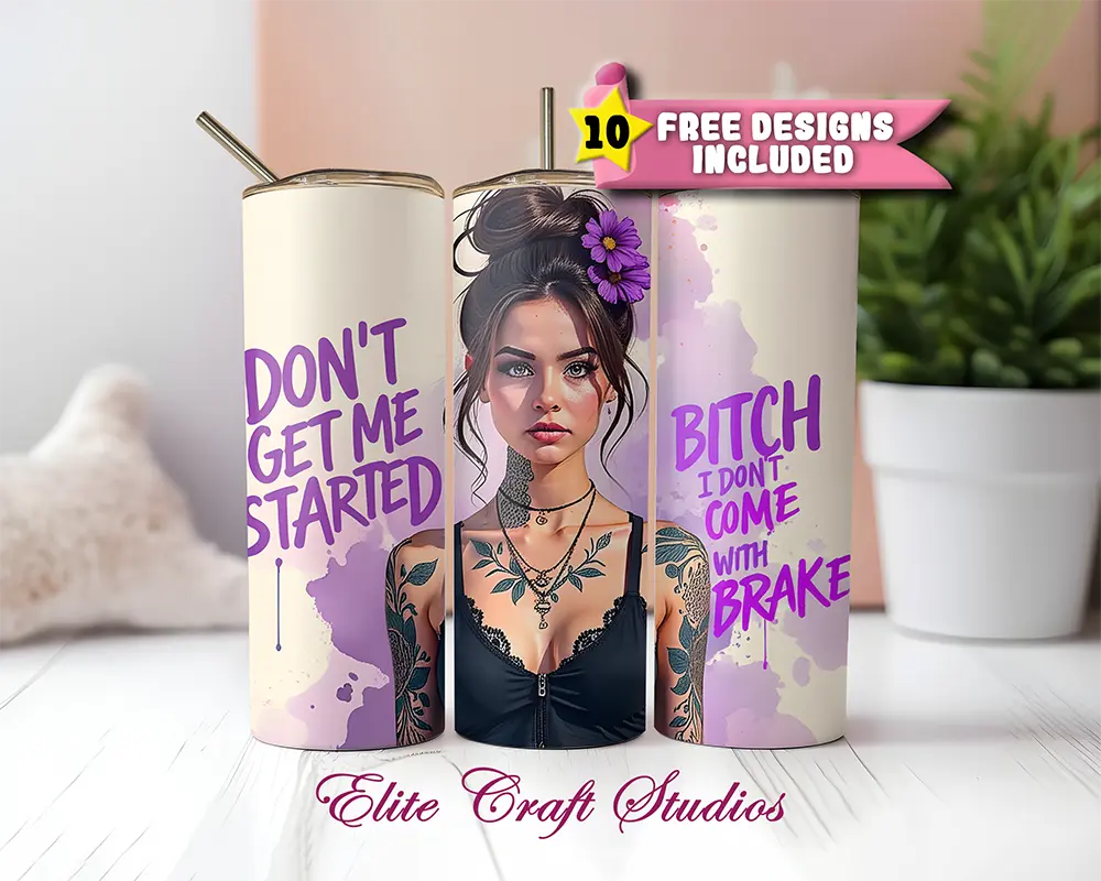 This edgy sublimation design features a powerful female figure, daring quotes like “Don’t Get Me Started” and “I Don’t Come with Brakes,” and a stunning purple aesthetic that commands attention.