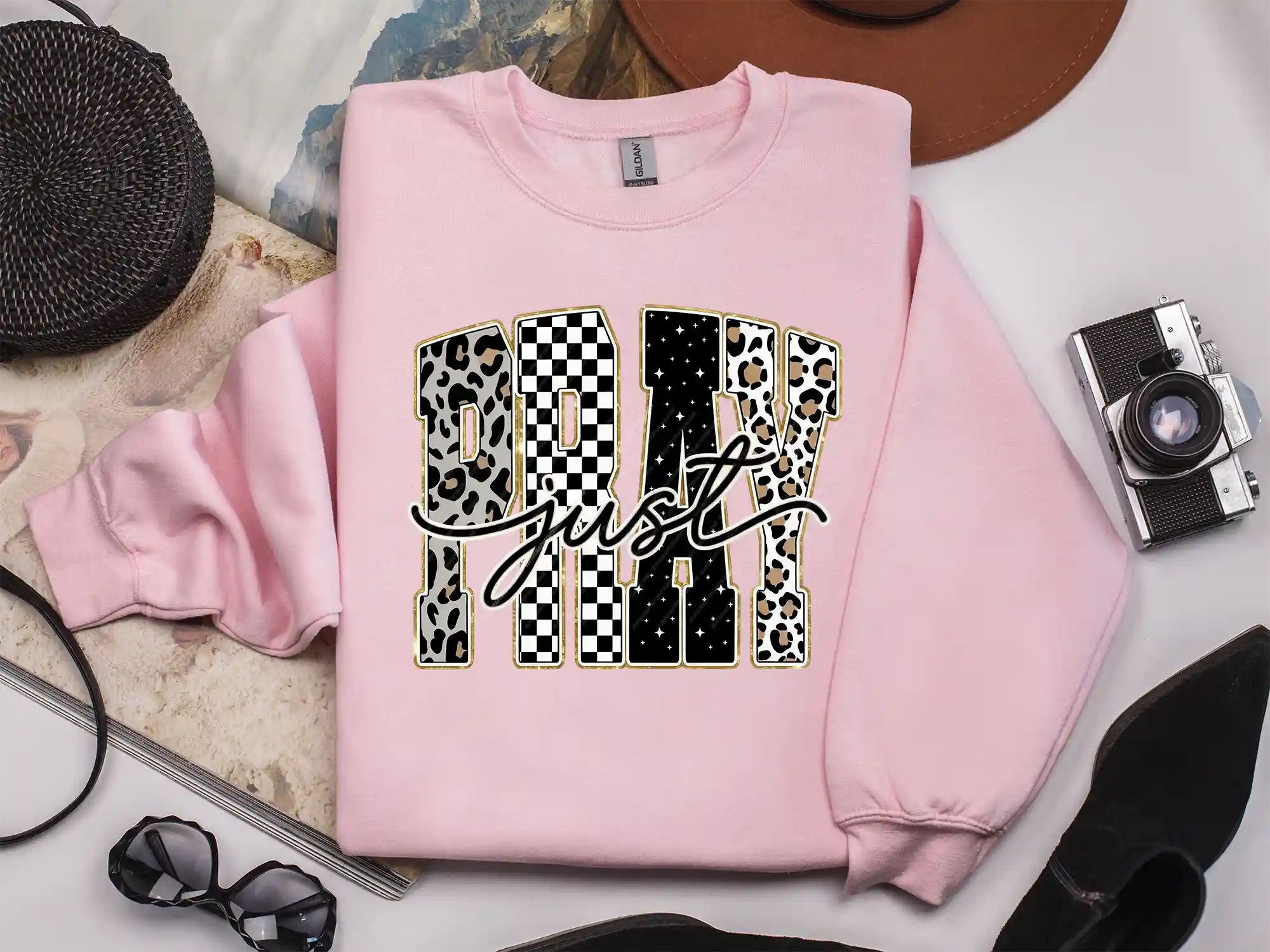 This Christian PRAY PNG is a bold and stylish faith design that blends varsity lettering, leopard print, classic checkered pattern, and subtle star accents into one powerful statement piece. The layered textures and gold glitter-style outline create a modern retro look that feels both trendy and meaningful.